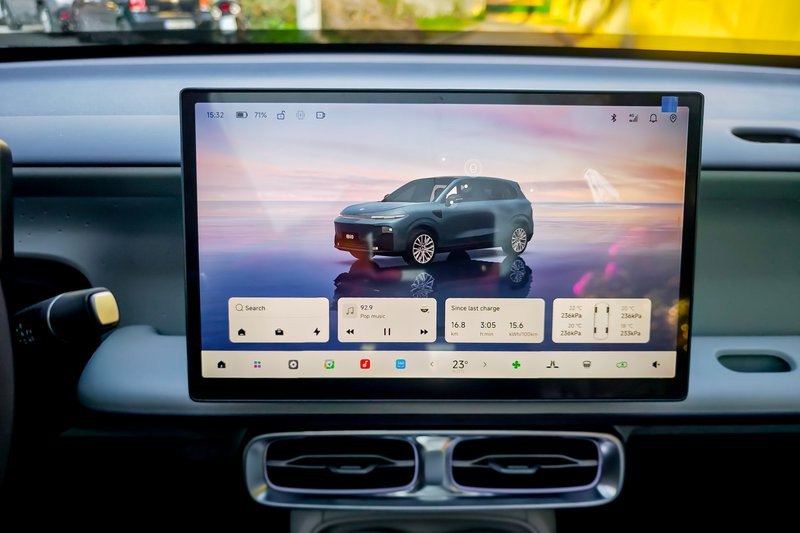 Στο κέντρο του ταμπλώ δεσπόζει η οθόνη αφής 14,6”, η οποίας «τρέχει» το λειτουργικό LEAP OS 4.0 Plus και μέσα από αυτή ο οδηγός μπορεί να ελέγξει σχεδόν όλα τα συστήματα του αυτοκινήτου. Από τον κλιματισμό μέχρι τη ρύθμιση των πλαϊνών καθρεπτών. Προφανώς δεν μιλάμε για μία πρακτική λύση όταν απαιτείται άμεση αντίδραση και αυτό το διαπιστώσαμε όταν χρειάστηκε να κλείσουμε τους πλαϊνούς καθρέπτες όσο προσπαθούσε να περάσει ξυστά δίπλα μας ένα μεγάλο φορτηγό. Ωστόσο, θα πρέπει να αναφέρουμε ότι για πολλές από αυτές τις λειτουργίες υπάρχουν συντομεύσεις που κάνουν τη διαδικασία λιγότερο χρονοβόρα.