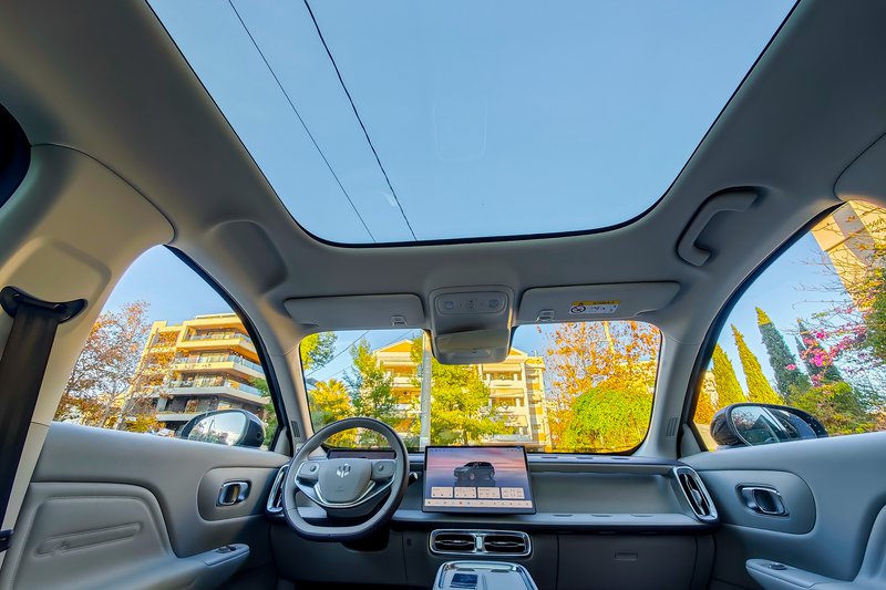 Κλειδί για να μπεις στο εσωτερικό δεν υπάρχει. Τον ρόλο αυτό αναλαμβάνει μια πλαστική κάρτα, στο μέγεθος πιστωτικής, η οποία πρέπει να περαστεί πάνω από το κάλυμμα του αριστερού εξωτερικού καθρέπτη ώστε να ξεκλειδώσουν οι πόρτες μέσω NFC. Σε αρκετές περιπτώσεις, αυτή η διαδικασία μπορεί να προκαλέσει εκνευρισμό. Ωστόσο, αξίζει να σημειωθεί ότι είναι διαθέσιμο το Leapmotor app, το οποίο, εφόσον εγκατασταθεί στο κινητό του οδηγού, επιτρέπει το κλείδωμα-ξεκλείδωμα καθώς και τον χειρισμό και άλλων λειτουργιών, με σαφώς πιο εύκολο και άμεσο τρόπο, μέσω της οθόνης του smartphone. Η καμπίνα είναι φωτεινή χάρη στη μεγάλη πανοραμική ηλιοροφή, ενώ η αισθητική της ακολουθεί μίνιμαλ φιλοσοφία, με τους φυσικούς διακόπτες να απουσιάζουν. Αρχικά το βλέμμα πέφτει στις δύο οθόνες. Η πρώτη, με διαγώνιο 8,8”, βρίσκεται πίσω από το flat-bottom τιμόνι με τη διχρωμία στο στεφάνι και λειτουργεί ως πίνακας οργάνων.