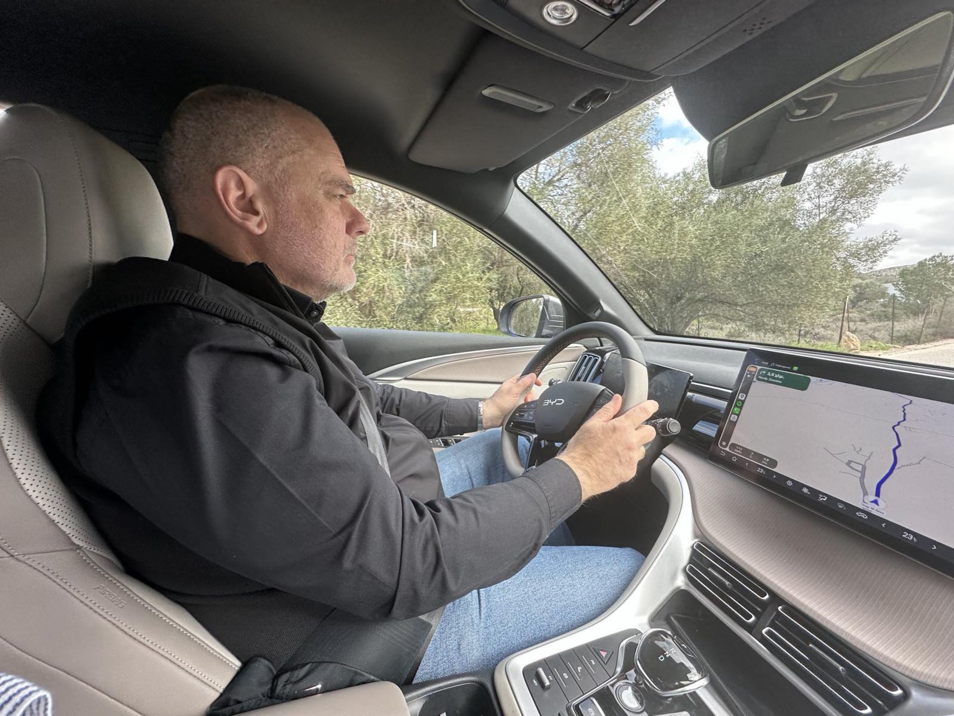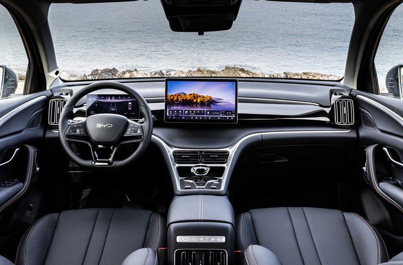 Στο εσωτερικό, άλλη μια φορά για μοντέλο της BYD μας υποδέχεται ένα φουτουριστικό λειτουργικό και πάντα ευρύχωρο εσωτερικό καμωμένο με πολλά μαλακά πλαστικά. Το ταμπλό φιλοξενεί ψηφιακό πίνακα οργάνων 8,8” και οθόνη αφής 12,8” υψηλής ανάλυσης για το infotainment η οποία εδώ δεν περιστρέφεται (και, μεταξύ μας, καλά κάνει). Το σύστημα υποστηρίζει φωνητικές εντολές, συνδεσιμότητα Apple και Android, OTA ενημερώσεις και εφαρμογές streaming με -όπως διαπιστώσαμε- πολύ καλή απόκριση και αναγνώριση φωνής. Η ρύθμιση του κλιματισμού γίνεται ακόμη και με κινήσεις τριών δακτύλων πάνω στην οθόνη, ενώ το interface είναι προσαρμόσιμo. Υπάρχουν επίσης δύο θύρες USB-C εμπρός και πίσω (60 W και 18 W), ενώ στην έκδοση Design προσφέρεται ασύρματη φόρτιση 15 W. Οι χώροι αποτελούν βασικό πλεονέκτημα καθώς 5 επιβάτες έχουν άνεση για κεφάλι και πόδια με το ικανό μεταξόνιο και το υψηλό σβήσιμο της οροφής να γίνονται σύμμαχοι προς αυτό όπως και τα μεγάλα πίσω κρύσταλλα που δίνουν πολύ "αέρα" στην καμπίνα.
