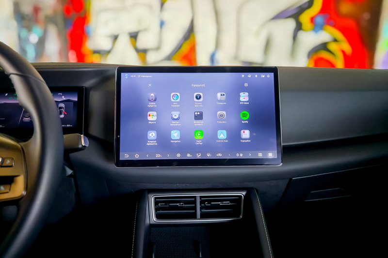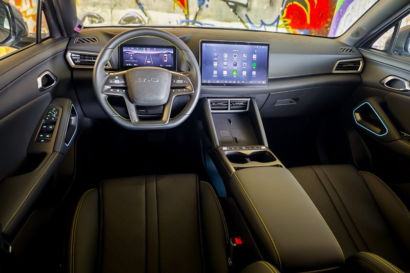 Στο εσωτερικό, η BYD δείχνει ότι έχει δώσει προσοχή σε λεπτομέρειες που κάνουν τη ζωή του οδηγού πιο εύκολη πράττοντας τα δέοντα. Στο κέντρο του ταμπλό δεσπόζει η σταθερή πλέον οθόνη αφής 12,8” (τσάμπα πήγε η πατέντα!) του συστήματος infotainment με πλοήγηση, ενώ ο ψηφιακός πίνακας οργάνων 8,8” μεταφέρει στον οδηγό όλες τις απαραίτητες πληροφορίες.