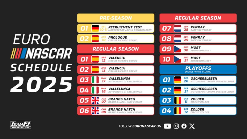 Η πίστα Brands Hatch θα φιλοξενήσει τον βρετανικό γύρο του EuroNASCAR στις 7-8 Ιουνίου, ενώ τρεις εβδομάδες αργότερα, στις 28-29 Ιουνίου θα διεξαχθεί στην οβάλ πίστα του Raceway Venray, η οποία έχει μήκος μισού μιλίου, ο ολλανδικός αγώνας. Αυτός θα είναι και ο μοναδικός αγώνας σε οβάλ πίστα εκτός της Αμερικής.