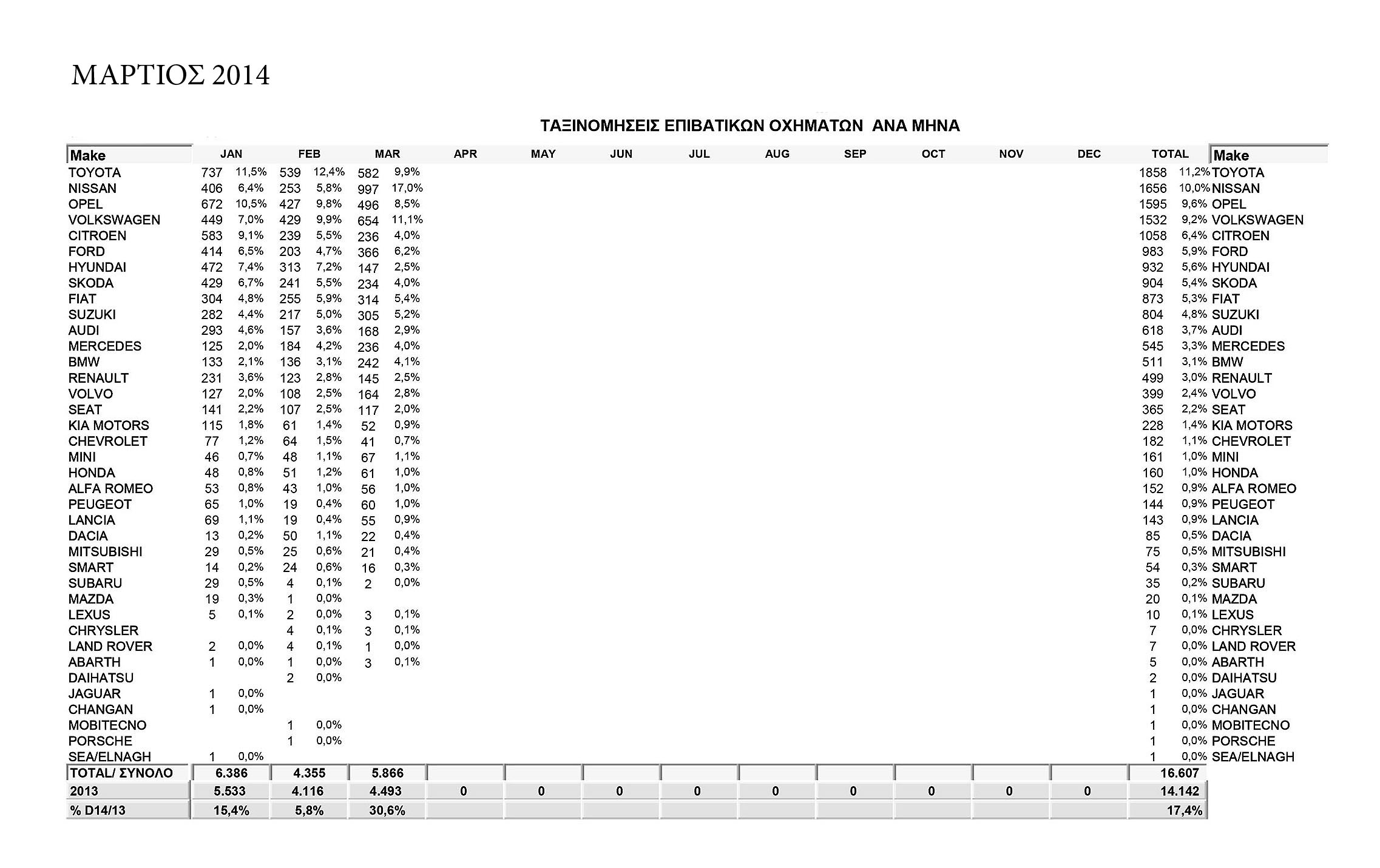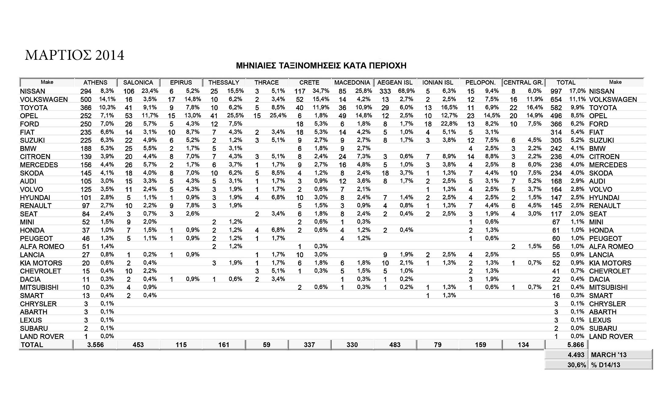 Το σύνολο για τους τρείς πρώτους μήνες του 2014 γράφει 16.607 μονάδες και αυτό σημαίνει αύξηση 17,4%! Πρόκειται για μια σημαντική ανάσα σε μια ταλαιπωρημένη από την κρίση αγορά, που φαίνεται ότι αρχίζει σιγά-σιγά να βρίσκει το δρόμο της. Αρκεί να την αφήσουν…