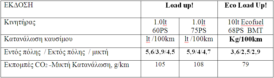 Ιδιαίτερα το eco load up! εφοδιάζεται με τον νέο τρικύλινδρο κινητήρα 999cc CNG απόδοσης 68PS με BlueMotion Technology. Ο συνδυασμός αυτός επιτυγχάνει εντυπωσιακές αποδόσεις σε επίπεδα αυτονομίας αλλά και οικονομίας χρήσης. Το eco up! καταναλώνει 2,9 kg CNG ανά 100km ενώ εκπέμπει μόλις 79gr/km CO2.