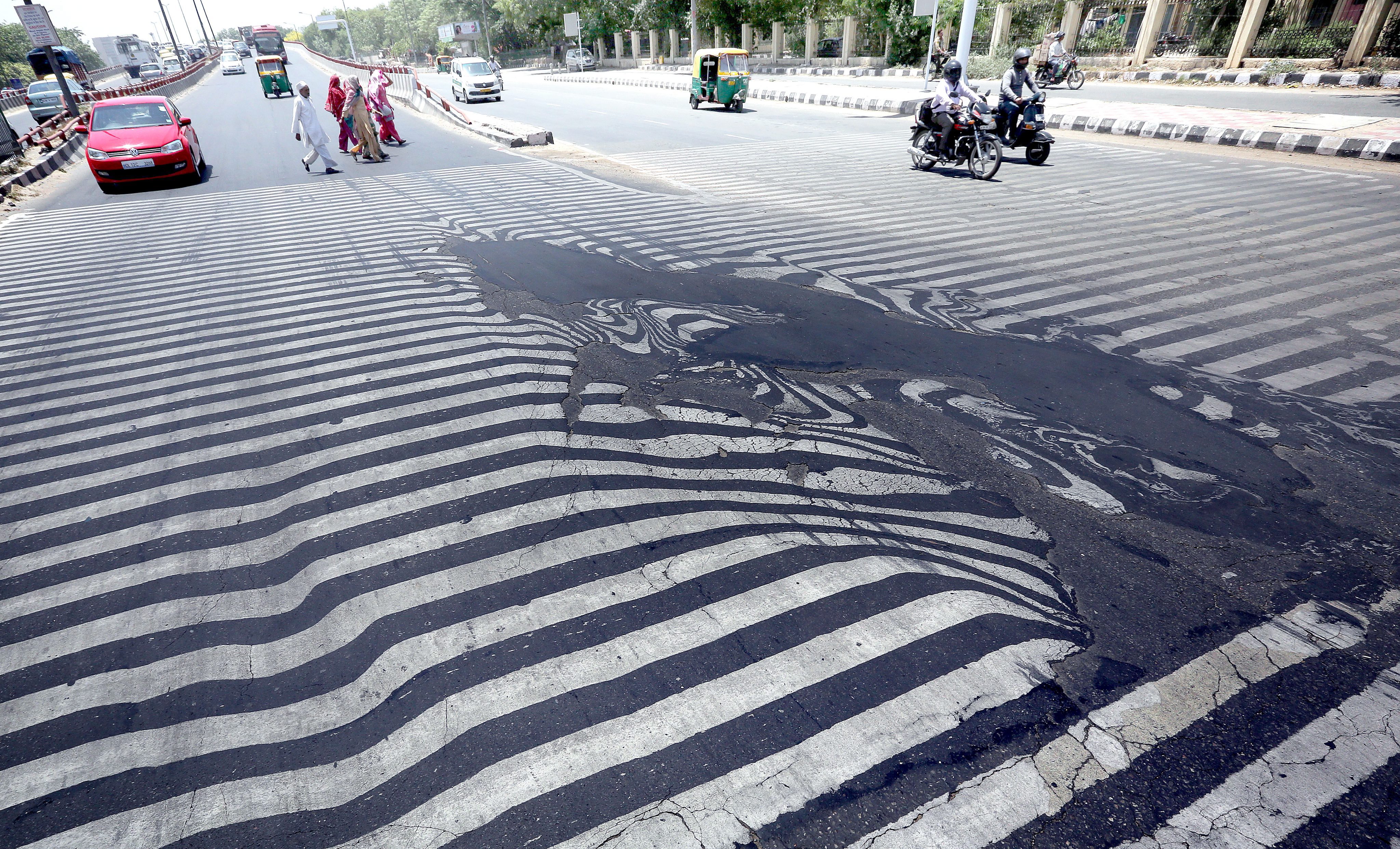 Στην πρωτεύουσα Νέο Δελχί, η ζέστη -την οποία πολλαπλασιάζει η αστική ασφυξία, οι αντανακλάσεις από τις γυάλινες επιφάνειες και η ζέστη που «εξάγεται» από τα κλιματιστικά- είναι αφόρητη. Και σαν να μη φτάνουν όλα αυτά, ένας καυτός, ξηρός άνεμος φυσάει και κατακαίει τα πάντα. Σε τέτοιο σημείο ώστε έλιωσαν δρόμοι!