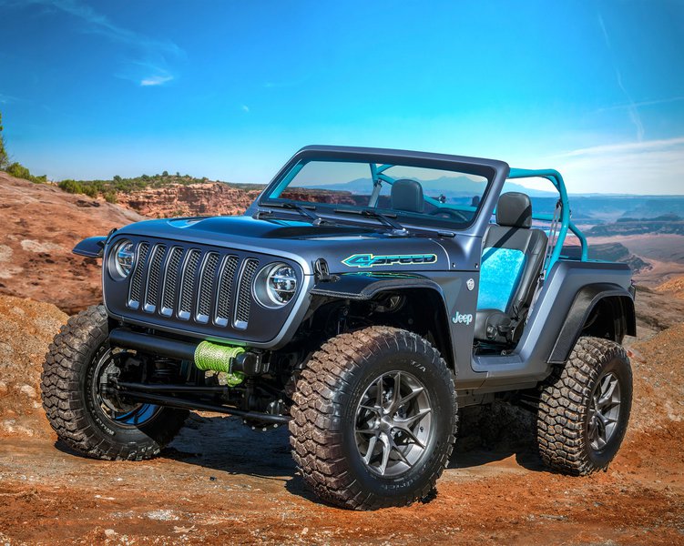 Το Jeep 4Speed με τη σειρά του δίνει έμφαση στη μείωση του βάρους και για αυτό διαθέτει αρκετό ανθρακόνημα -το καπό και οι επεκτάσεις των φτερών είναι αποκλειστικά από το συγκεκριμένο υλικό- ενώ ο κινητήρας είναι ο turbo των 2.000 cc, που θα έρθει και στην Ευρώπη. Όσο το δυνατόν πιο μικροί είναι και οι προφυλακτήρες, ενώ οι τροχοί είναι 35 ιντσών και οι άξονες Dana 44.