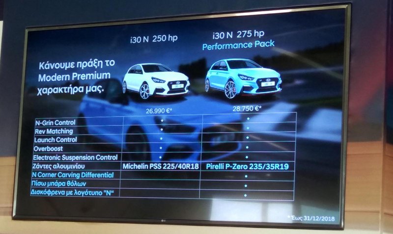 Ταυτόχρονα ανακοίνωσε τις τιμές πώλησης που πραγματικά… προκαλούν αφού είναι χαμηλότερες ακόμη και από αυτές της γερμανικής αγοράς. Συγκεκριμένα, η βασική έκδοση του i30N με τα 250 PS κοστίζει από 26.990€ και όπως μπορείτε να δείτε από την σχετική εικόνα τα έχει φορά ελαστικά Michelin PSS διάστασης 225/40 R18. Η ισχυρότερη έκδοση i30Ν Performance Pack αποδίδει 275 PS και έχει μεγαλύτερους 19άρηδες τροχούς με ελαστικά Pirelli P Zero νούμερο 235/35.
