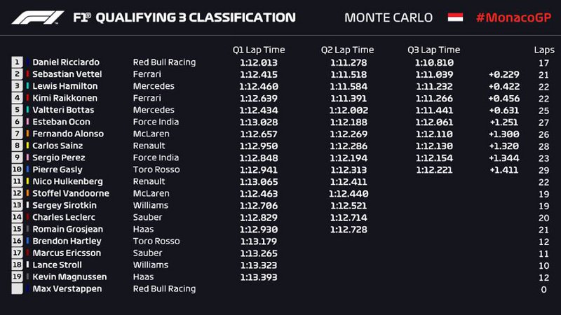 Η καλή μέρα φάνηκε από νωρίς για τις Red Bull που σε όλες τις φάσεις των δοκιμών έδειξαν να τους ταιριάζει απόλυτα το φετινό Γκραν Πρι στο Μονακό. Τελικά την πρώτη θέση στην εκκίνηση -και σημαντικό προβάδισμα για τη νίκη, σ' αυτόν τον ιδιαίτερο αγώνα- πήρε ο Daniel Ricciardo, ο οποίος παίρνει την δεύτερη pole σ' αυτόν τον αγώνα (το είχε ξανακάνει το 2016).