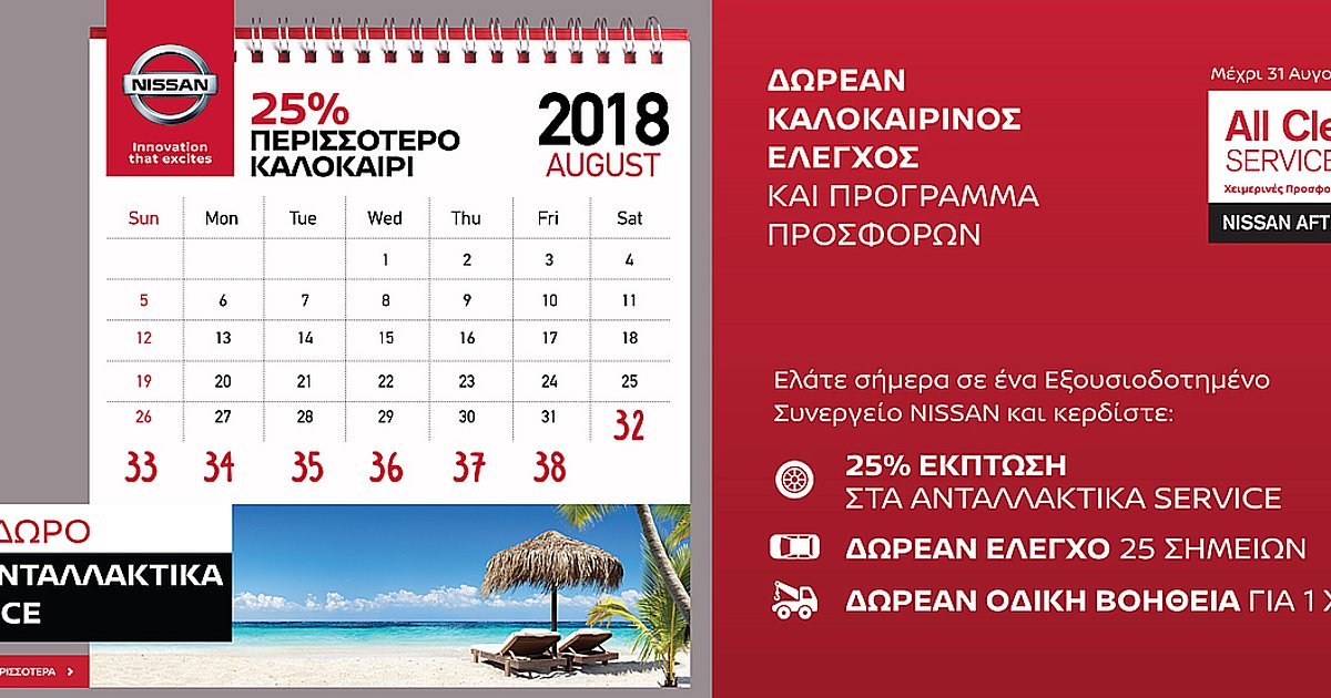 Χάρη στις μοναδικές προσφορές της Nissan με το πρόγραμμα All Clear Service, σε όλους τους κατόχους μοντέλων της, το καλοκαίρι θα κρατήσει 25%... παραπάνω.