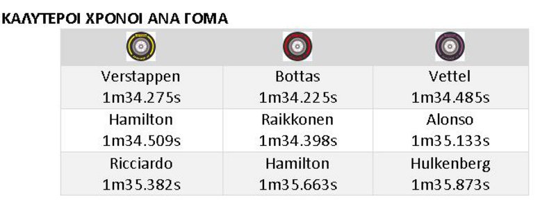 Είδαμε μερικούς να διανύουν μεγάλες αποστάσεις με τη μαλακή γόμα. Επίσης είδαμε τους Sebastian Vettel, Valtteri Bottas να τερματίζουν σε καλές θέσεις παρότι ακολούθησαν διαφορετικές στρατηγικές δυο αλλαγών. Οι Ferrari,Mercedes έκαναν δυο διαφορετικές, επιλογές στρατηγικής, στα μονοθέσιά τους αντιδρώντας στις συνθήκες αγώνα. Αυτό επιβεβαίωσε την προσδοκία που είχαμε ότι και οι τρεις διαθέσιμες γόμες θα ήταν χρήσιμες επιλογές στη χάραξη μιας συνολικής στρατηγικής αγώνα, που θα κατέληγε σε δυνατή απόδοση.