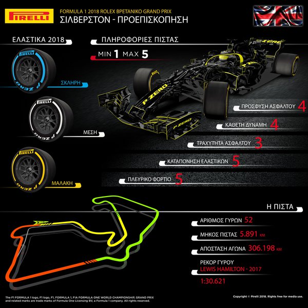 “Το Silverstone αποτελούσε πάντοτε μεγάλη πρόκληση για τα ελαστικά λόγω των πλευρικών φορτίσεων που φτάνουν ή και ξεπερνούν τα 5g. Ακριβώς γι’ αυτό αποφασίσαμε να φέρουμε για πρώτη φορά τη σκληρή γόμα στο Silverstone ώστε ν’ αντιμετωπίσουμε μερικές από τις πιο υψηλές απαιτήσεις της σεζόν. Παραταύτα καθώς όλη η γκάμα είναι ένα επίπεδο πιο μαλακή από πέρυσι, ο φετινός συνδυασμός γομών είναι ισοδύναμος με τον περσινό.