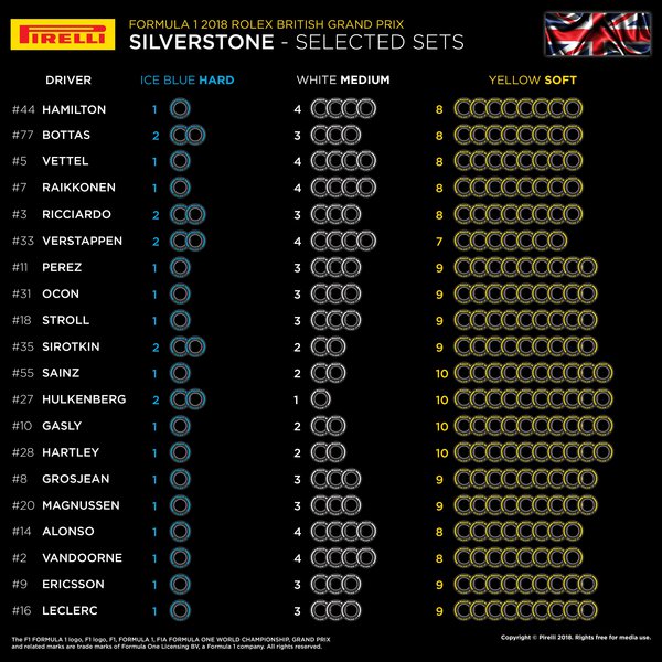 Έτσι ο φετινός συνδυασμός γομών της σκληρής με τη μέση και τη μαλακή γόμα είναι αντίστοιχος με τον περσινό. Το Βρετανικό Grand Prix ολοκληρώνει την πρώτη τριπλέτα συνεχόμενων αγώνων στην ιστορία της Formula 1. Η ομάδα της Pirelli θα παραμείνει στην πίστα μετά τον αγώνα για δοκιμές εξέλιξης των ελαστικών του 2019.