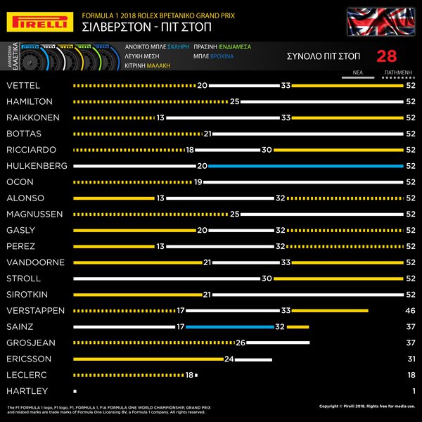 Πρόκειται για την μαλακότερη εκ των διαθεσίμων γομών στο συγκεκριμένο αγώνα. Εντωμεταξύ οι οδηγοί της Mercedes έμειναν με τη μέση γόμα που είχαν βάλει στο μοναδικό τους πιτ στοπ ώστε να διατηρήσουν τη θέση τους στην προσωρινή κατάταξη του αγώνα.