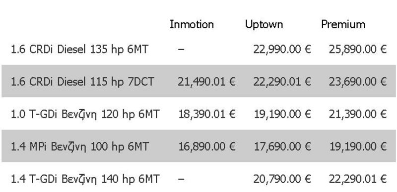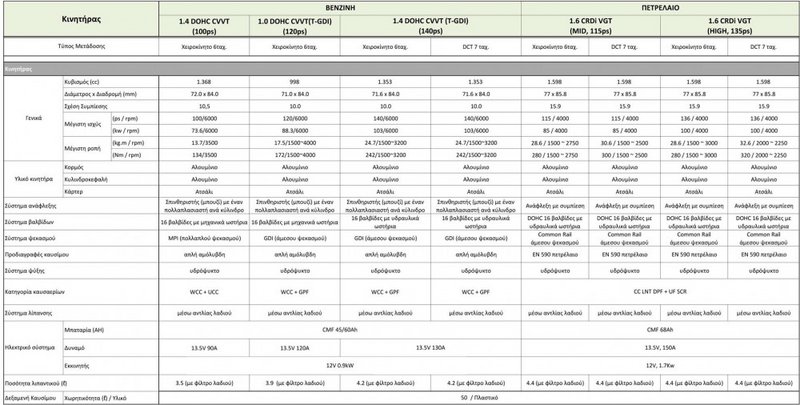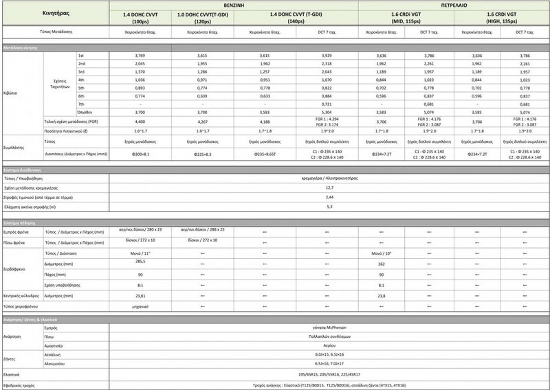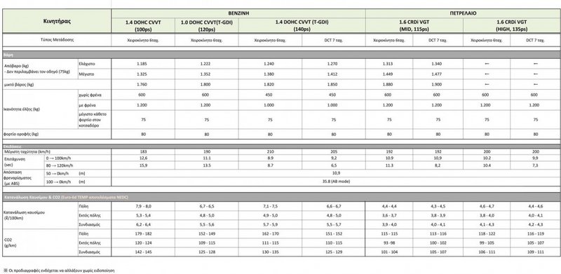 Πιο πάνω υπάρχει ο 3κύλινδρος χιλιάρης turbo των 120 ίππων καθώς και ο τετρακύλίνδρος, επίσης turbο των 1.400 κυβικών και των 140 ίππων. Oι diesel είναι η έκδοση των 115 ίππων του 1.600 CRDi με το αυτόματο κιβώτιο διπλού συμπλέκτη των 7 σχέσεων και η πιο ισχυρή των 136 ίππων.