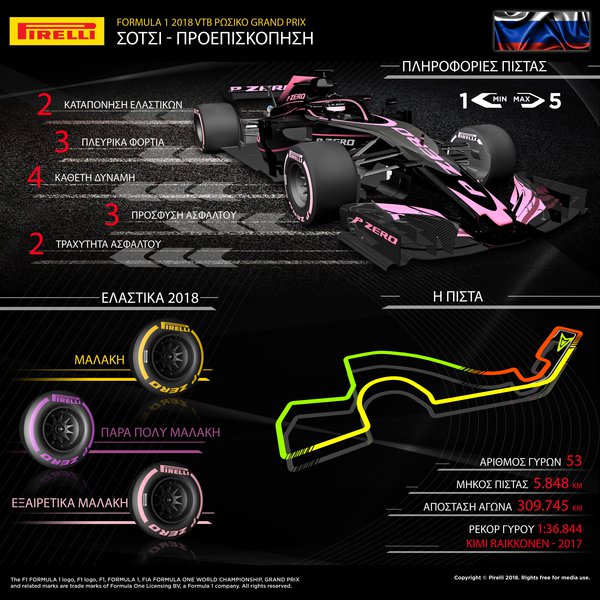 Θεωρητικά είναι το ιδανικό πεδίο δράσης της εξαιρετικά μαλακής γόμας. Παραταύτα και καθότι το συγκεκριμένο ελαστικό δεν έχει αγωνιστεί ξανά στην Ρωσία οι ομάδες πρέπει να κατανοήσουν τα χαρακτηριστικά του όσο πιο γρήγορα μπορούν στις ελεύθερες δοκιμές ώστε να βρουν την στρατηγική του αγώνα. Θα έχει ενδιαφέρον να δούμε πως η ροζ εξαιρετικά μαλακή γόμα θα αποδώσει σ’ αυτή την πίστα ειδικά στην απαιτητική στροφή 3.”