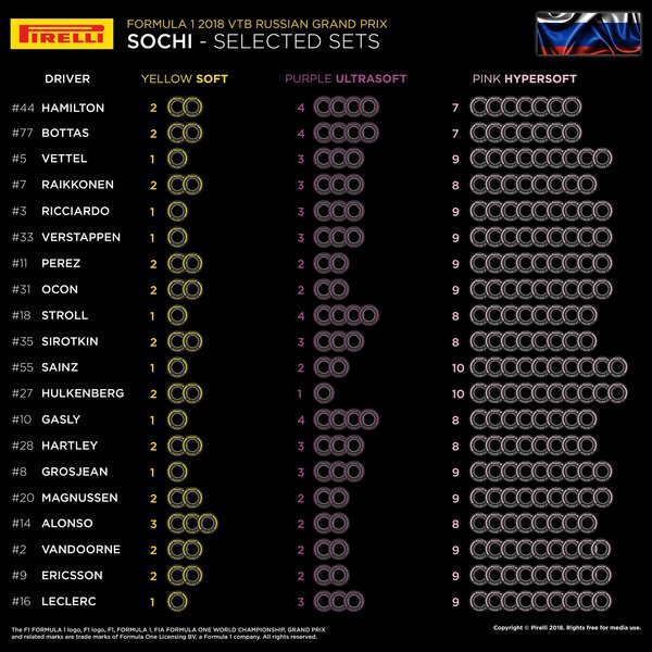 Η εξαιρετικά μαλακή γόμα (hypersoft) – το ταχύτερο και πιο μαλακό ελαστικά στη γκάμα Pirelli Formula 1 – που συντελεί στην κατάρριψη των ρεκόρ σε κάθε πίστα που χρησιμοποιείται, πάει τώρα στη Ρωσία σε συνδυασμό με την πάρα πολύ μαλακή (ultrasoft) και την μαλακή (soft) γόμα. Πρόκειται για τον ίδιο συνδυασμό γομών που χρησιμοποιήθηκε και στη Σιγκαπούρη με ένα «κενό» ανάμεσα στις γόμες, καθότι λείπει η πολύ μαλακή (supersoft).