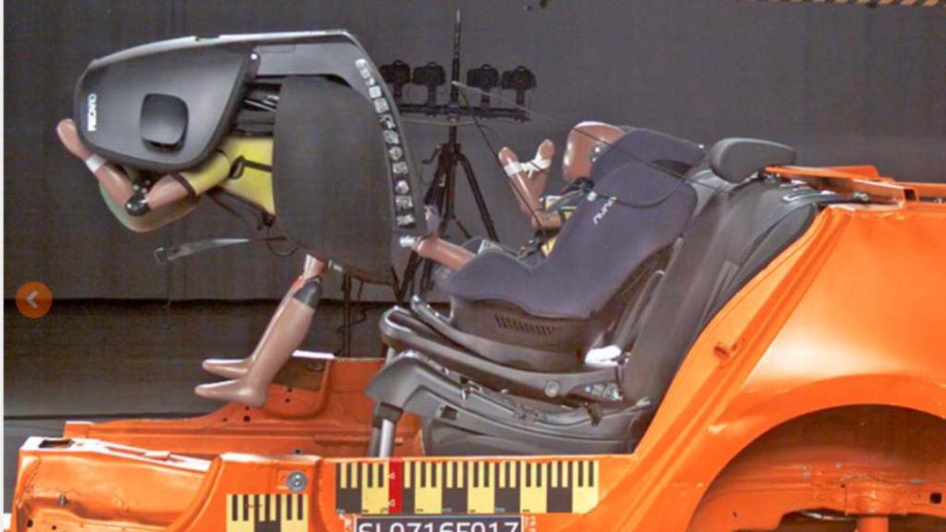 • Το παιδί είναι μικρόσωμο για το κάθισμα: Στην αντίθετη περίπτωση, το ανδρείκελο αντιπροσωπεύει ένα παιδί 1,5 ετών, το οποίο είναι πολύ μικρόσωμο για ένα κάθισμα της ομάδας 2/3. Κατά την πρόσκρουση, το ανδρείκελο βγαίνει από τη ζώνη και ουσιαστικά συγκρατείται από τη ζώνη ασφαλείας στη μέση του. Στην πραγματικότητα, η περιστροφική κίνηση του σώματος θα μπορούσε να προκαλέσει σοβαρούς τραυματισμούς στο παιδί.