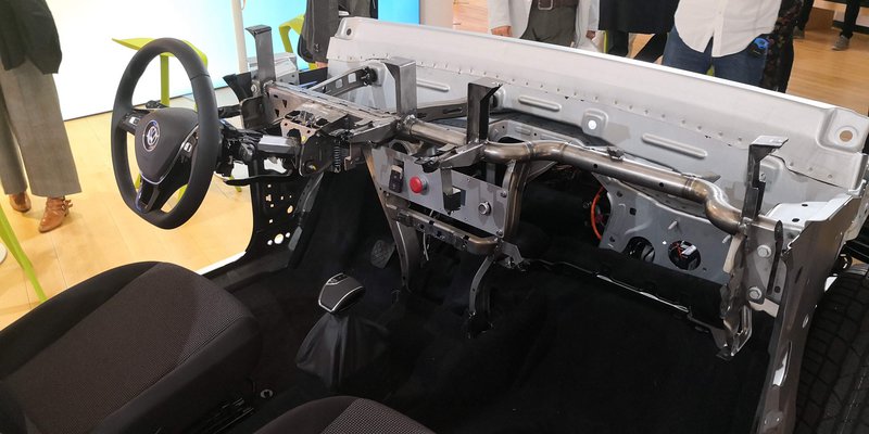 Πατώντας πάνω στην πλατφόρµα MEB οµολογώ πως µου έκανε εντύπωση η απόσταση του δαπέδου (προσοχή, όχι του κάτω µέρους του αυτοκινήτου από το έδαφος, αλλά εκεί που βρίσκεται το πατάκι για να γίνω πιο σαφής). Λογικό, αφού ακριβώς από κάτω βρίσκεται το πακέτο µε τις µπαταρίες που βρίσκονται ανάµεσα στους δύο άξονες. Με αυτό τον τρόπο επιτυγχάνεται και το χαµηλό κέντρο βάρους.