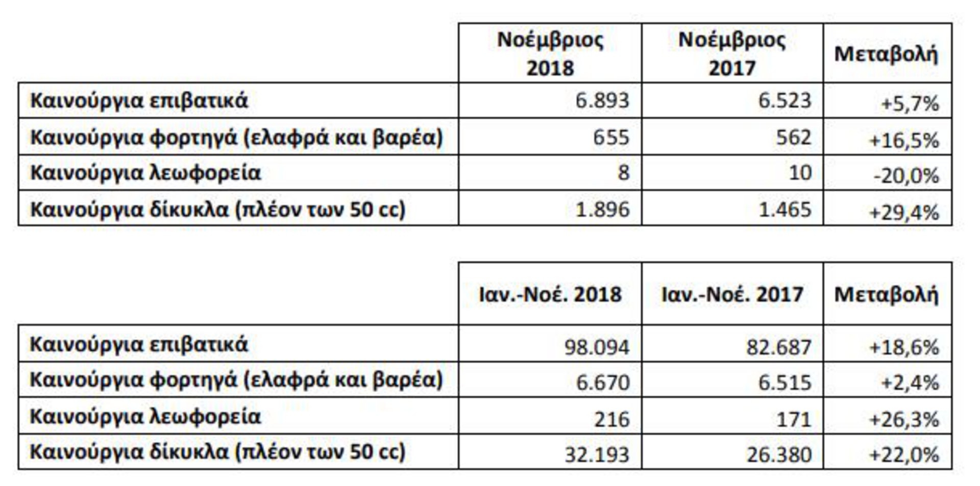 Συνολικά, στο ενδεκάμηνο Ιανουαρίου-Νοεμβρίου 2018 οι ταξινομήσεις καινούργιων επιβατικών είναι αυξημένες κατά +18,6% ως προς το αντίστοιχο διάστημα του 2017.