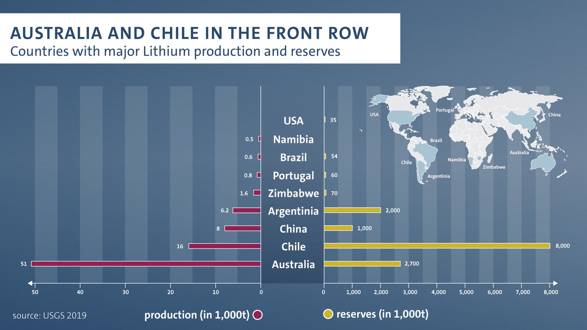 Με 51.000 τόνους το 2018, η Αυστραλία ήταν με διαφορά ο πιο σημαντικός προμηθευτής λιθίου - μπροστά από τη Χιλή (16.000 τόνοι), την Κίνα (8.000 τόνοι) και την Αργεντινή (6.200 τόνοι). Αυτό φαίνεται από τα στοιχεία του USGS (United States Geological Survey). Οι παραπάνω τέσσερις χώρες κυριαρχούν εδώ και πολλά χρόνια στην αγορά, ενώ η Αυστραλία έχει κερδίσει ένα σαφές προβάδισμα έναντι της Χιλής τα τελευταία έτη.