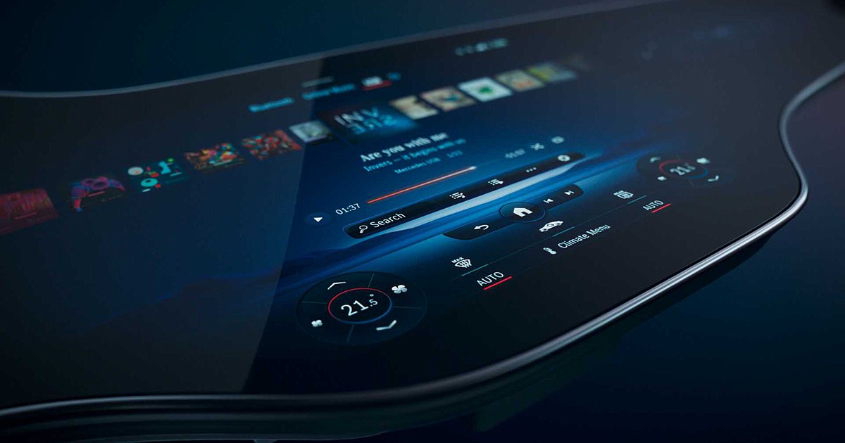 Ουσιαστικά μιλάμε για μία ενιαία, επίπεδη, γυάλινη επιφάνεια, η οποία ενσωματώνει τρεις μεγάλες οθόνες αφής. Μία για τον πίνακα οργάνων, μία μεγαλύτερη για το MBUX, το infotainment της Γερμανικής φίρμας και μία τρίτη, στην πλευρά του συνοδηγού.