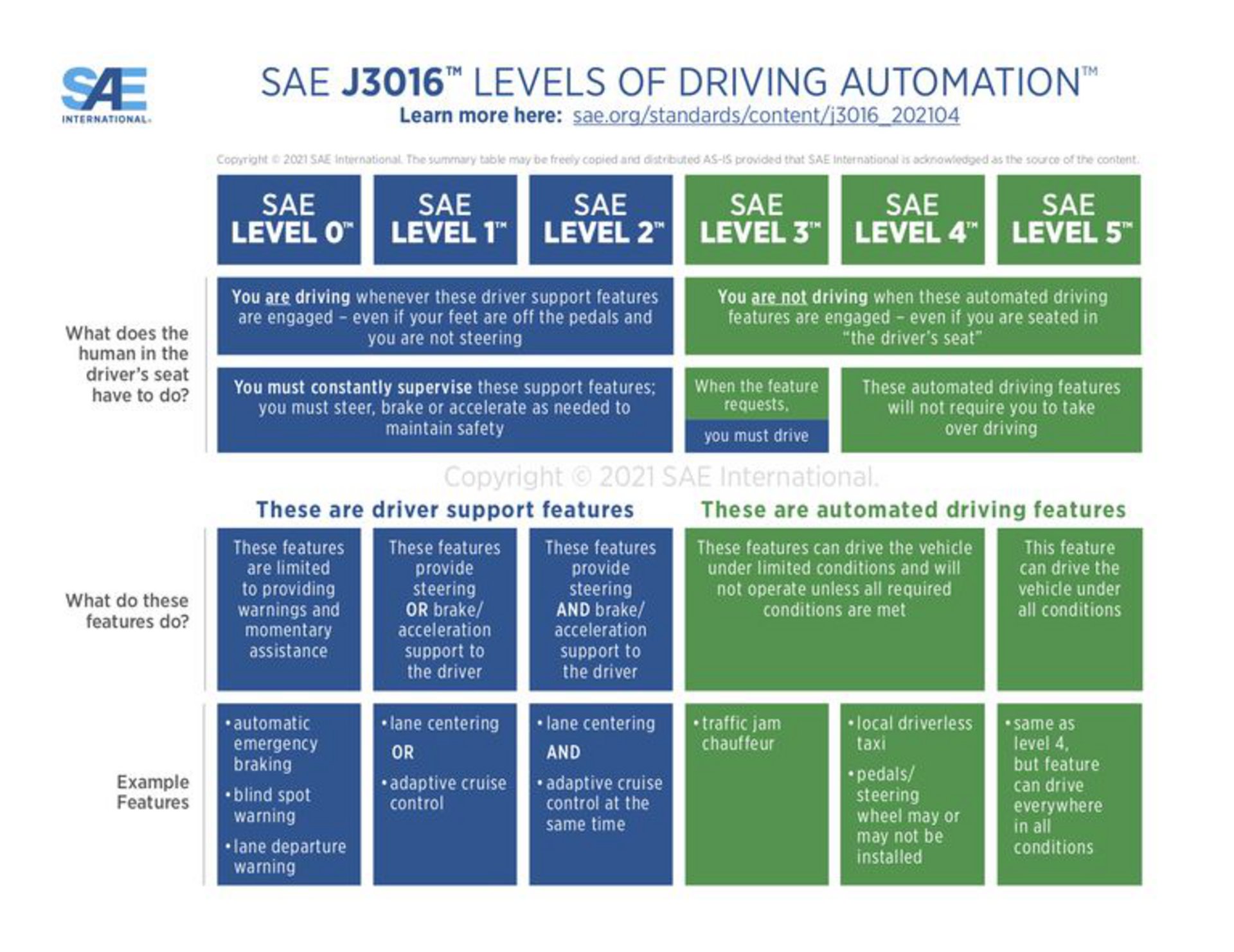 Η Επιτροπή Τεχνικών Προτύπων SAE International, ενημέρωσε το γράφημα (βλ. παρακάτω) Levels of Driving Automation με περισσότερους ορισμούς για τα αυτόνομα συστήματα επιπέδου 3 και 4, τα οποία βρίσκονται στο επάνω μέρος προς την πλήρη αυτόνομη οδήγηση. Το βασικό πλαίσιο παραμένει το ίδιο, με έξι διαφορετικά επίπεδα από το 0 έως το 5, να κλιμακώνονται μεταξύ ενός αυτοκινήτου που δεν μπορεί να υποστηρίξει καθόλου την αυτόνομη οδήγηση και ενός που είναι πλήρως ικανό για αυτόνομη κίνηση.