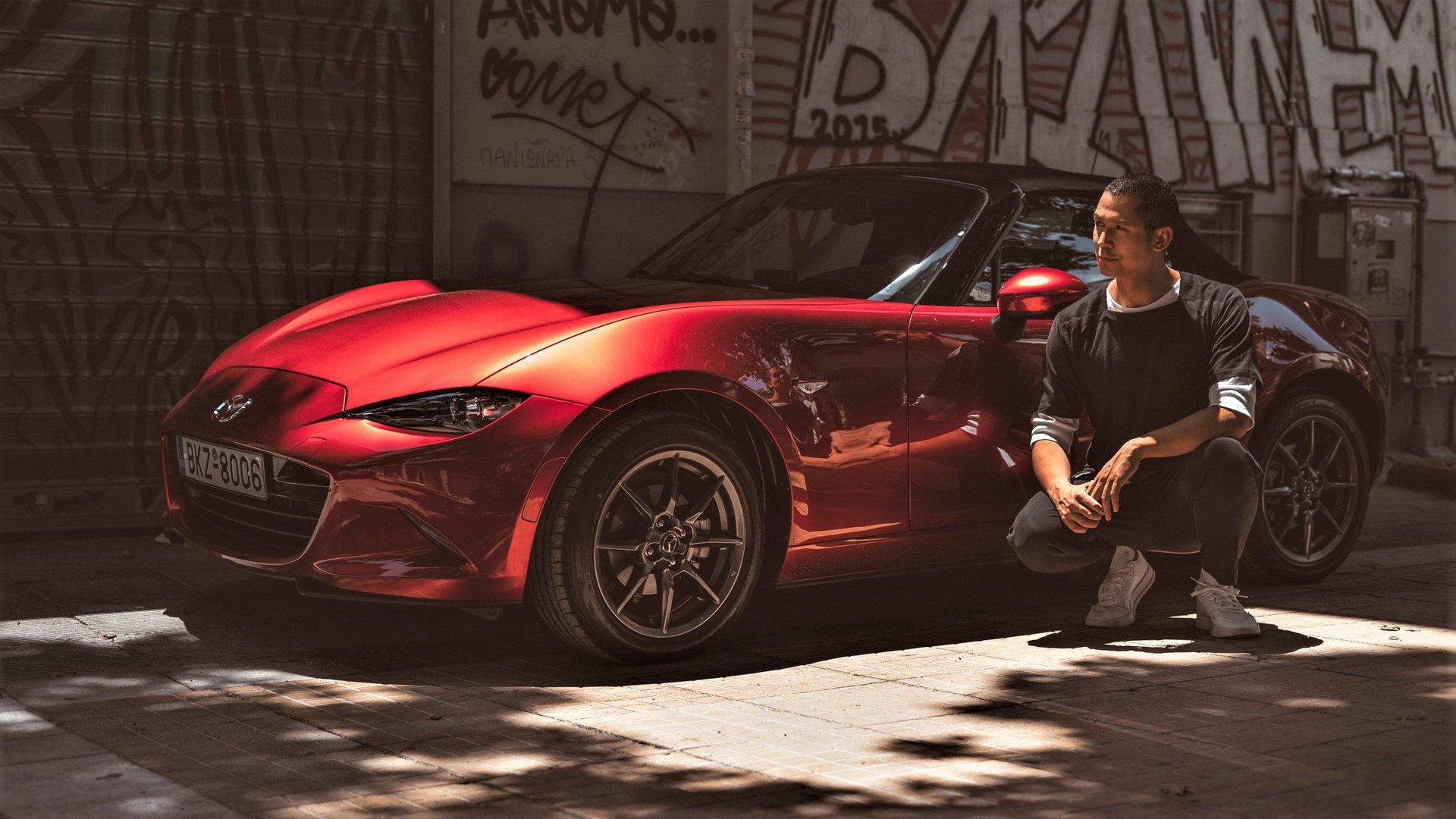 Πίσω από το τιμόνι ενός MX-5, το θρυλικό μοντέλο της Mazda που δεν αφήνει κανέναν ασυγκίνητο, o Σωτήρης βιώνει αυτό που η μάρκα διαχρονικά πρεσβεύει: Jinba Ittai, ή αλλιώς την εναρμονισμένη και απόλυτη σύνδεση του οδηγού με το αυτοκίνητο.