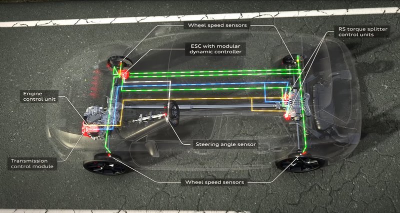 Το RS Torque Splitter καθιστά δυνατό τον ενεργό, πλήρως μεταβλητό διαμοιρασμό ροπής μεταξύ των πίσω τροχών. Σε αντίθεση με το διαφορικό του πίσω άξονα και το προηγούμενο πακέτο πολύδισκου συμπλέκτη, ο κατανεμητής ροπής χρησιμοποιεί από έναν ηλεκτρονικά ελεγχόμενο πολύδισκο συμπλέκτη σε κάθε ημιαξόνιο. Κατά τη δυναμική οδήγηση, ο κατανεμητής ροπής αυξάνει τη ροπή κίνησης στον εξωτερικό πίσω τροχό με το υψηλότερο φορτίο, γεγονός που μειώνει σημαντικά την τάση υποστροφής.