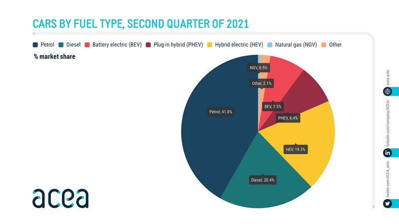 Σύμφωνα με τα επίσημα στοιχεία της Ένωσης Ευρωπαίων Κατασκευαστών Αυτοκινήτου (ACEA) για το δεύτερο τρίμηνο του 2021, τα νέα «εξηλεκτρισμένα» αυτοκίνητα που ταξινομήθηκαν στην Ευρωπαϊκή Ένωση γνωρίζουν αξιοσημείωτη άνοδο.