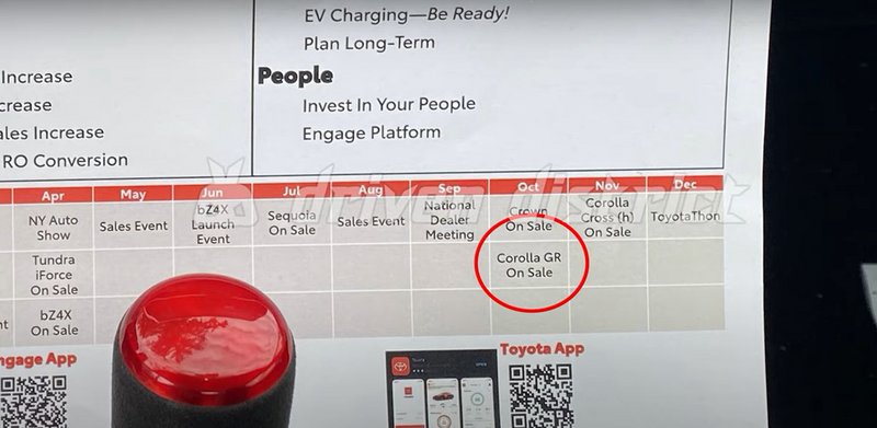 Στο 1:20 του video εμφανίζεται πως η Toyota GR Corolla έχει προγραμματιστεί να λανσαριστεί τον ερχόμενο Οκτώβριο. Την ίδια στιγμή στην πίσω μεριά του εγγράφου παρουσιάζεται ο στόχος πωλήσεων που έχει οριστεί στις -μόλις- 90 μονάδες.