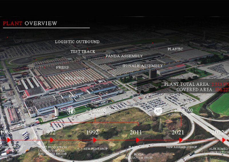 Η συνολική του έκταση είναι 2.214.000 τ.μ. εκ των οποίων το 1/4 εξ αυτών αφορούν τις στεγασμένες εγκαταστάσεις στις οποίες τρέχουν αυτή τη στιγμή δύο διαφορετικές γραμμές παραγωγής: του Fiat Panda και της Alfa Romeo Tonale. Το πρώτο αυτοκίνητο που κατασκευάστηκε εκεί ήταν η θρυλική Alfasud, γνωστή και ως Alfa Romeo του Νότου, ενώ έκτοτε άλλα 5.000.000 μονάδες προωθήθηκαν στις αγορές όλου του κόσμου.