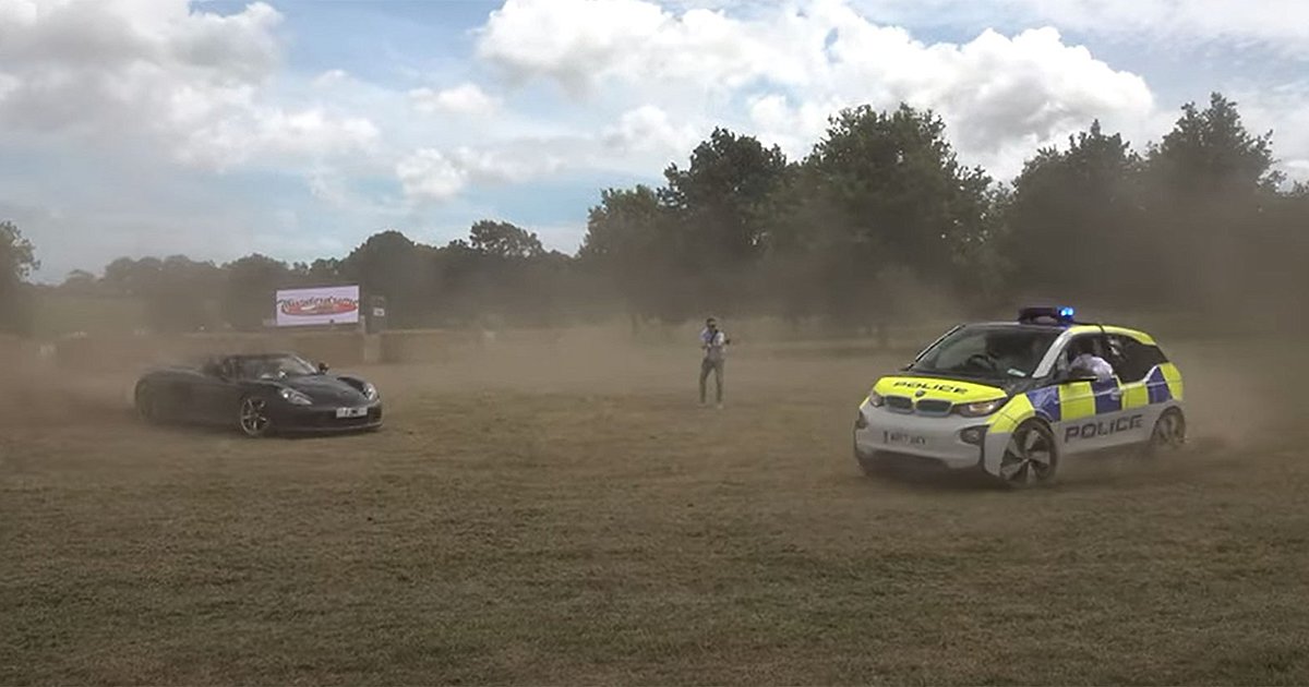 Χάρηκαν όλοι; Όχι! Η τοπική αστυνομία έδειξε τη δυσφορία της. Ένα περιπολικό έκανε την εμφάνισή του την ώρα που η Porsche Carrera GT «έδινε ρέστα». Και το θέαμα, ένα EV BMW i3 περιπολικό δίπλα στο «θηρίο», ήταν σίγουρα… μοναδικό!