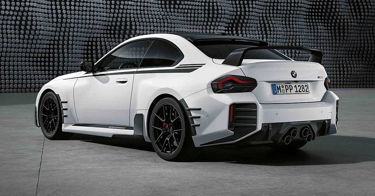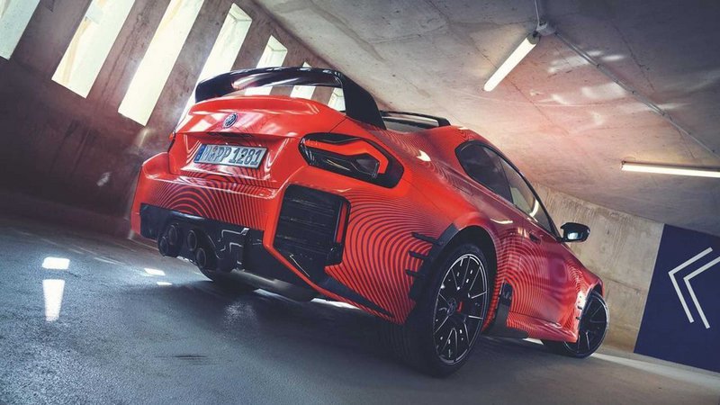 Στο πίσω μέρος, η M2 απέκτησε επίσης την χαρακτηριστική τετραπλή εξάτμισηπου φέρουν οι M3 και M4ως προεπιλογή, με την «μικρή» M να μη χάνει τίποτα, οπτικά, σε σύγκριση με τα άλλα δύο μοντέλα. Τα τετράγωνα που του πίσω προφυλακτήρα έχουν γίνει μαύρα ενώ ο διαχύτης είναι κατασκευασμένος από ανθρακόνημα.