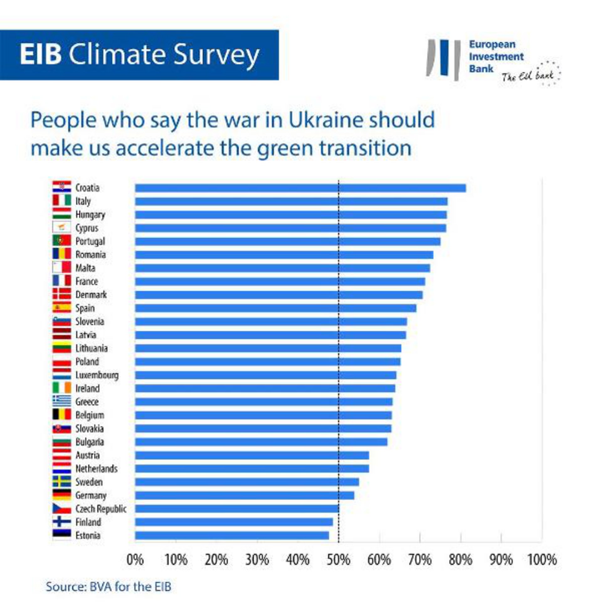 Το ποσοστό των Ελλήνων που θεωρεί ότι ο πόλεμος στην Ουκρανία πρέπει να επιταχύνει τις διαδικασίες για την πράσινη μετάβαση αντιστοιχεί στο 63% και είναι κοντά στον ευρωπαϊκό μέσο όρο (66%). Πρώτη χώρα στον σχετικό πίνακα είναι η Κροατία ενώ αντίστοιχα στον... πάτο βρίσκονται Εσθονία και Φιλανδία με ποσοστό κάτω του 50%.