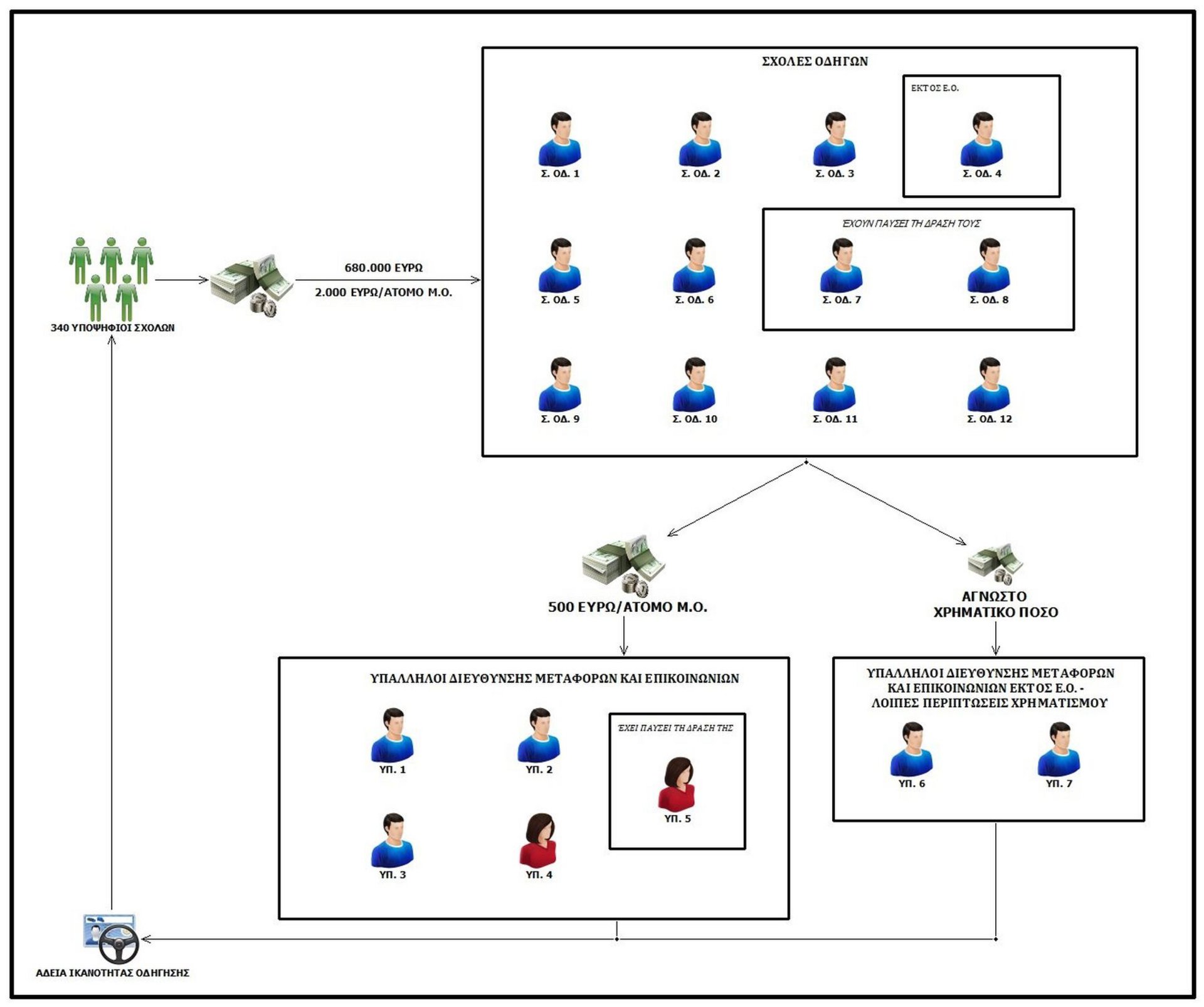 Όπως έγινε γνωστό η εγκληματική οργάνωση είχε στηθεί από ιδιοκτήτες σχολών οδήγησης και υπαλλήλους Διευθύνσεων Μεταφορών και Επικοινωνιών, οι οποίοι μέσω της ψευδούς βεβαίωσης – νόθευσης, της δωροδοκίας και της δωροληψίας, επεδίωκαν και κατάφερναν, να αποκτούν άδεια ικανότητας οδήγησης, άτομα που -υπό κανονικές συνθήκες- θα αποτύγχαναν στις σχετικές εξετάσεις.