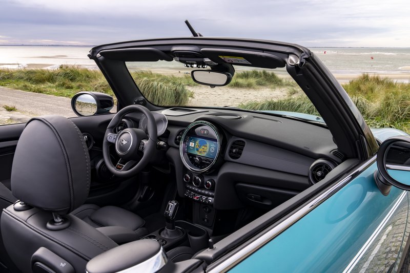 Το εσωτερικό του Mini Convertible Seaside Edition είναι επίσης εμπνευσμένο από τη θάλασσα, φέροντας τον ίδιο χρωματικό συνδυασμό. Οι δύο λευκές γραμμές του εξωτερικού μεταφέρονται και στις πόρτες της καμπίνας του κάμπριο, με την ίδια επιγραφή 'Seaside' να είναι επίσης παρούσα. Τα καθίσματα είναι ντυμένα με δέρμα σε Carbon Black χρωματισμό, ενώ οι υπόλοιπες λεπτομέρειες του εσωτερικού έρχονται σε πλήρη αρμονία με τους χρωματισμούς του αμαξώματος, Caribbean Aqua και Nanuq White αντίστοιχα.