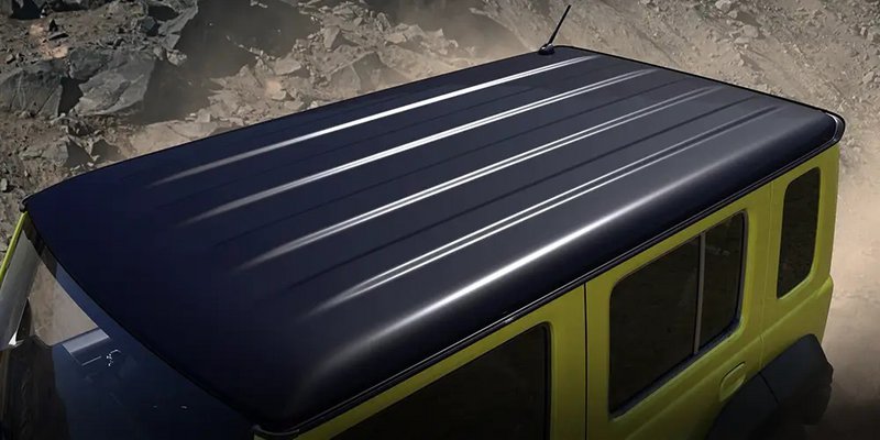 Το 5θυρο Jimny διατηρεί τις κάθετες σχεδιαστικές γραμμές και έχει μαύρη οροφή για αντίθεση με το κύριο χρώμα Kinetic Yellow. Οι φουσκωμένοι θόλοι των τροχών, οι στρογγυλοί προβολείς, η μπροστινή μάσκα με σχάρες και τα ελαστικά εκτός δρόμου είναι μερικά από τα γνωστά χαρακτηριστικά που κληρονομήθηκαν από το μοντέλο 3 θυρών. Οι ζάντες είναι 15 ιντσών με ελαστικά 195/80 και διαθέτει εφεδρικό τροχό με μαύρο κάλυμμα τοποθετημένο πίσω.
