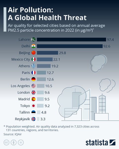 Μεγάλο ενδιαφέρον για τη χώρα μας και συγκεκριμένα για την Αθήνα, παρουσιάζει ο πίνακας της πλατφόρμας αναλύσεων Statista με επιλεγμένες πόλεις του πλανήτη που είναι επιβαρυμένες σε ατμοσφαιρική ρύπανση.