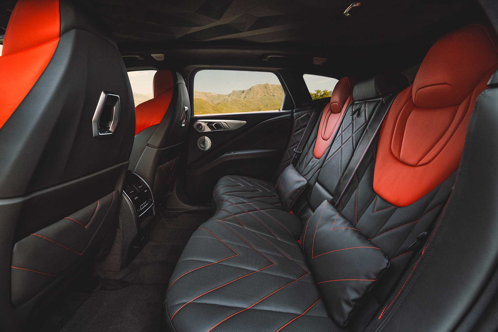 Ο συνδυασμός μαύρου/κόκκινου προσδίδει επίσης μια ελκυστική, σπορ νότα στο εσωτερικό της BMW XM Label Red. Η χαρακτηριστική τρισδιάστατη επένδυση οροφής και οι επενδύσεις για τις κολόνες του αμαξώματος έχουν μαύρες επιφάνειες. Το κόκκινο χρώμα χρησιμοποιείται για να προσδώσει μια επιπλέον αίσθηση αποκλειστικότητας στα ρομβοειδούς σχήματος άνω τμήματα των πλατών και στα ενσωματωμένα προσκέφαλα των καθισμάτων για τον οδηγό και τον συνοδηγό, καθώς και στα εξωτερικά πίσω καθίσματα. Η συνολική εμφάνιση ολοκληρώνεται από τις κόκκινες ραφές αντίθεσης στις μαύρες επιφάνειες των καθισμάτων, του πίνακα οργάνων, των επενδύσεων των θυρών και της κεντρικής κονσόλας, καθώς και από τις επίσης κόκκινες πινελιές στους αεραγωγούς.