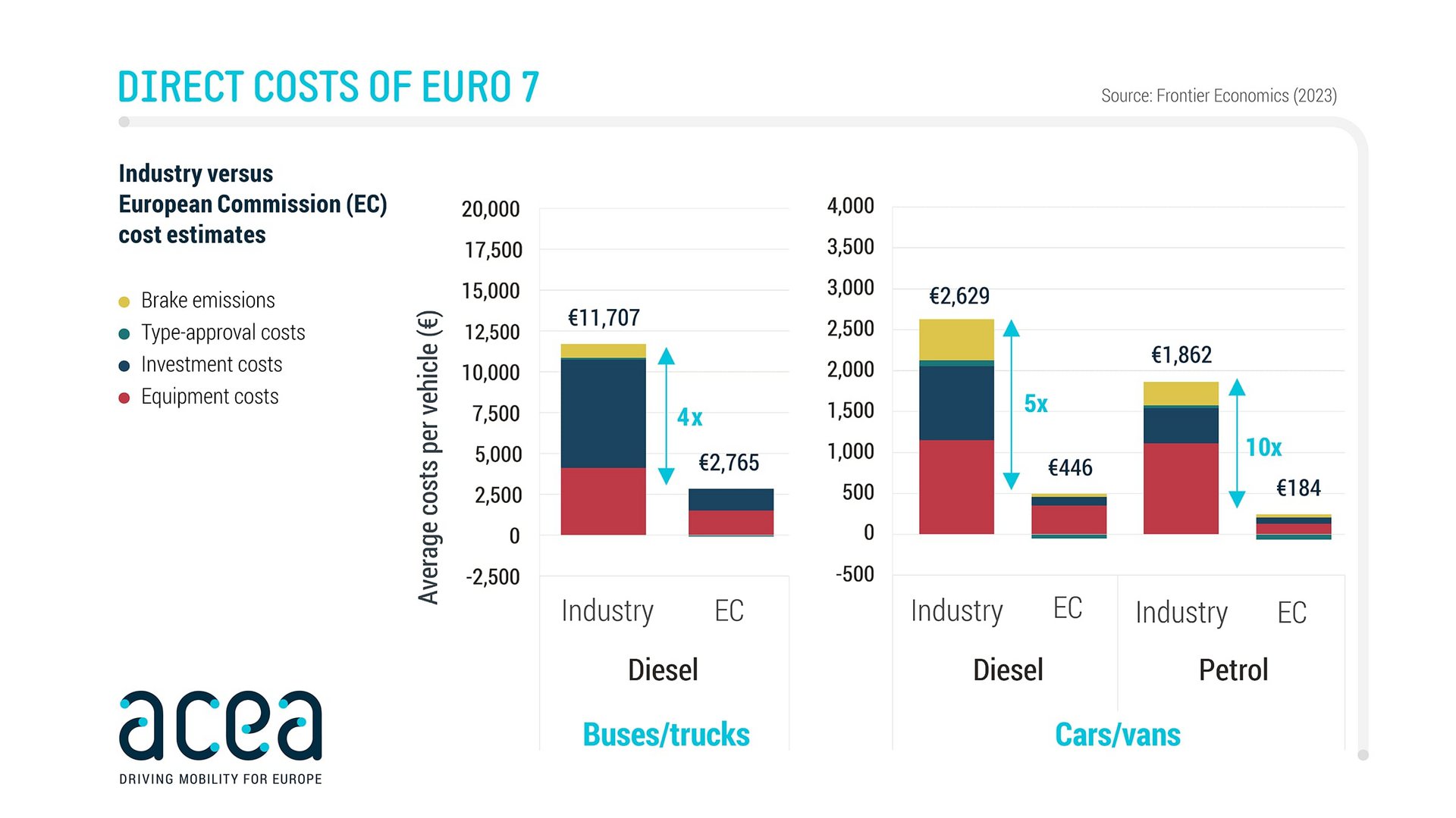 Σχετική έρευνα διεξήγε η Frontier Economics, εταιρεία οικονομικής συμβουλευτικής, παρουσιάζοντας την πραγματική αύξηση που θα επιφέρουν οι νέοι κανονισμοί, σε σχέση με τους υπολογισμούς της ΕΕ. Το κόστος κάθε αυτοκινήτου αναμένεται να αυξηθεί κατά 2.000 ευρώ, ενώ η αντίστοιχη αύξηση για κάθε λεωφορείο και φορτηγό ανέρχεται στα 12.000 ευρώ. Οι εκτιμήσεις της ΕΕ ήταν περιορισμένες στα 180-450 ευρώ ανά αυτοκίνητο και van, και 2.800 ευρώ ανά λεωφορείο και φορτηγό.