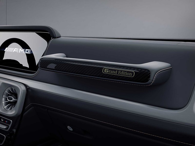 Πλάκες με χρυσό λογότυπο AMG και χρυσή μπορντούρα είναι τοποθετημένες στις πλάτες των καθισμάτων. Τα πατάκια είναι επίσης φινιρισμένα σε μαύρο χρώμα και διακοσμημένα με χρυσές ραφές. Οι χειρολαβές οροφής είναι φινιρισμένες με δέρμα νάπα, ενώ το διακοσμητικό κομμάτι στο ένθετο της χειρολαβής στην πλευρά του συνοδηγού είναι φτιαγμένο από ανθρακονήματα και φέρει επίσης ένα σήμα υψηλής ποιότητας με τις λέξεις «Grand Edition». Άλλα διακοσμητικά μέρη του εσωτερικού είναι φινιρισμένα σε carbon με χάλκινες ραφές. Το τιμόνι AMG Performance από μικροΐνες DINAMICA διαθέτει επιγραφή G 63.