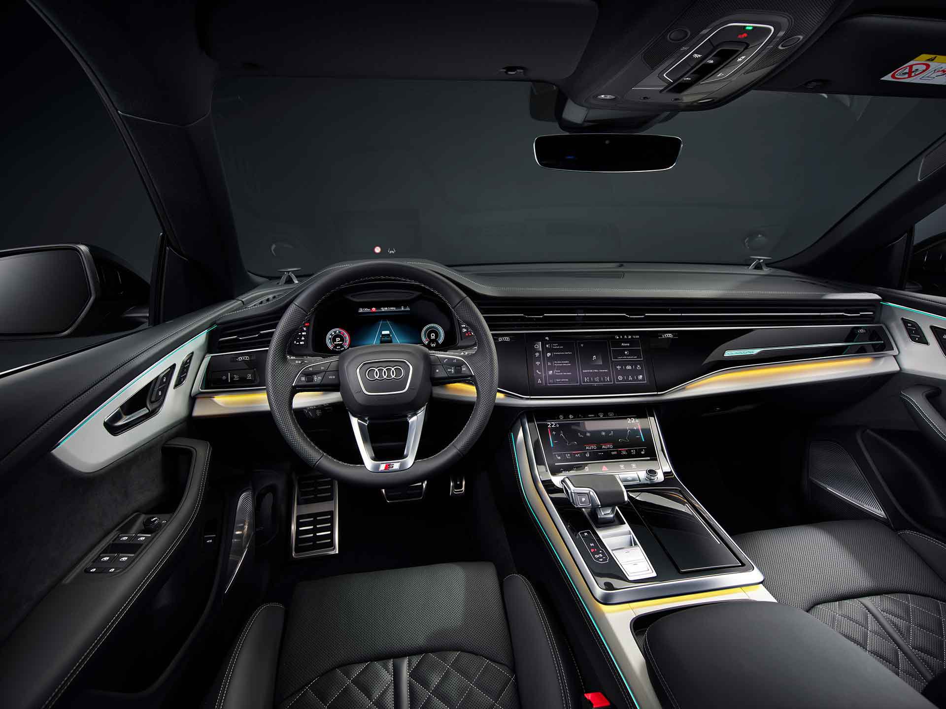 Περνώντας στο εσωτερικό, οι ραφές στην επένδυση του καθίσματος στο βασικό μοντέλο διατίθενται πλέον στάνταρ σε γκρι χρώμα με αντίθεση. Υπάρχουν επίσης εννέα διακοσμητικά ένθετα διαθέσιμα, με διαφορετικές επιλογές για τη βασική έκδοση, το σπορ πακέτο S line καθώς και για το SQ8 TFSI.