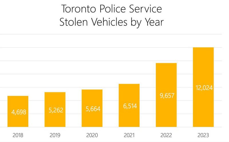 Στο Τορόντο τα τελευταία έξι χρόνια οι κλοπές των αυτοκινήτων έχουν εκτοξευτεί. Τα στοιχεία δείχνουν ότι το 2018 σημειώθηκαν 4.698 περισταστικά, ωστόσο το 2023 απογειώθηκαν στα 12.024. Αυτό σημαίνει ότι πέρυσι, κάθε 40 λεπτά ένα αυτοκίνητο... έκανε φτερα!