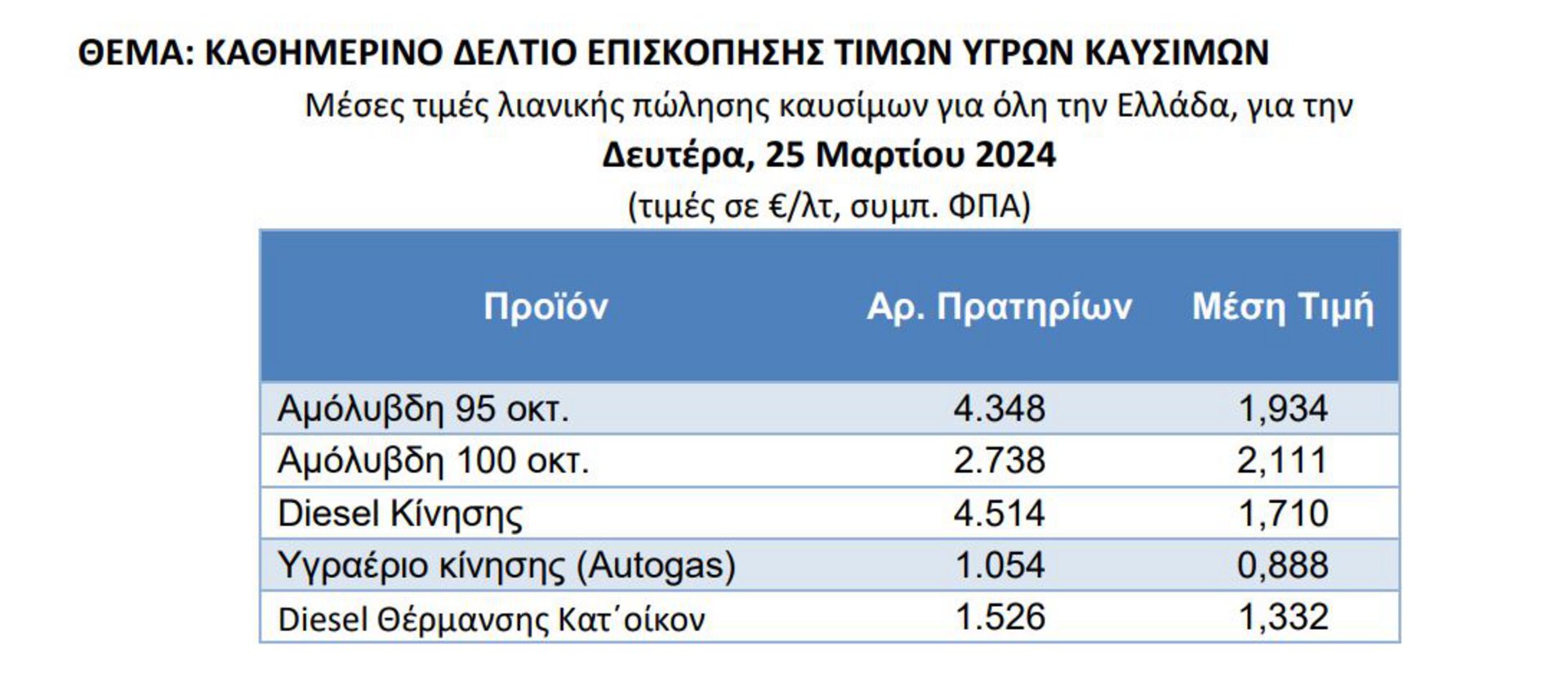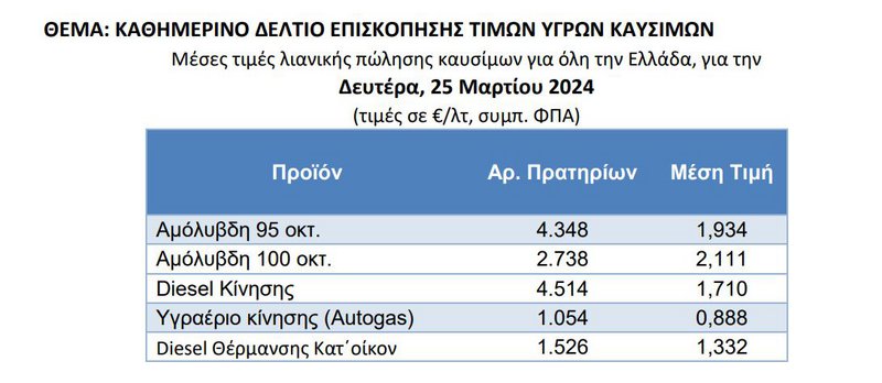 Σύμφωνα με το Παρατηρητήριο Τιμών Υγρών Καυσίμων, η μέση τιμή λιανικής πώλησης σε όλη τη χώρα τη Δευτέρα 25 Μαρτίου 2024 ήταν 1,934 ευρώ το λίτρο για την αμόλυβδη 95 οκτανίων, 2,111 ευρώ για την 100άρα και 1,710 ευρώ για το πετρέλαιο κίνησης.