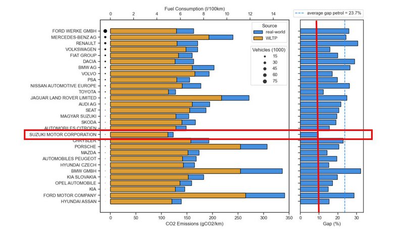 Το αναφερόμενο έγγραφο βασίζεται σε δεδομένα που συλλέχθηκαν το 2021 και αποτυπώνουν το αποτέλεσμα των μετρήσεων του 2,5% των αυτοκινήτων της Suzuki εκ του συνόλου των πωλήσεών της (ταξινομήσεις 2021). Να σημειώσουμε ότι ο μέσος όρος για τα αυτοκίνητα βενζίνης είναι 23,7%, ενώ η SuzukiMotorCorporation έχει τη χαμηλότερη απόκλιση, 9,43%.