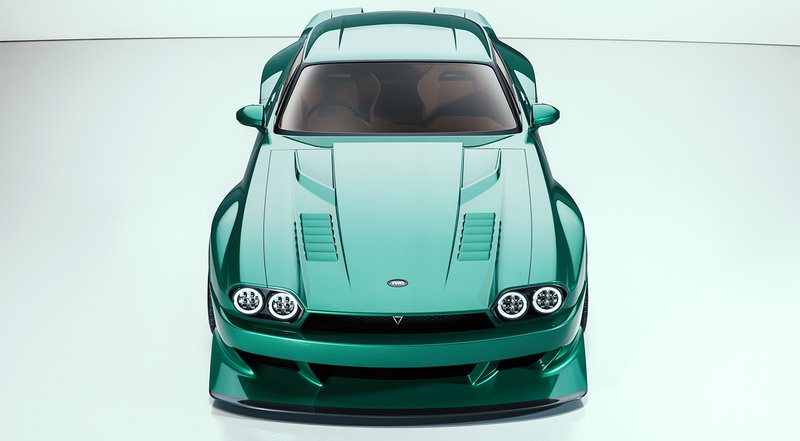 Στο μπροστινό μέρος έχει τοποθετηθεί μια μεγάλη αεροτομή κι ένας προφυλακτήρας με έντονες εισαγωγές αέρα, όπως και στρόγγυλοι προβολείς LED, που περιβάλλονται από τα κλασικά εξάγωνα πλαίσια που βρίσκει κανείς στην XJS.