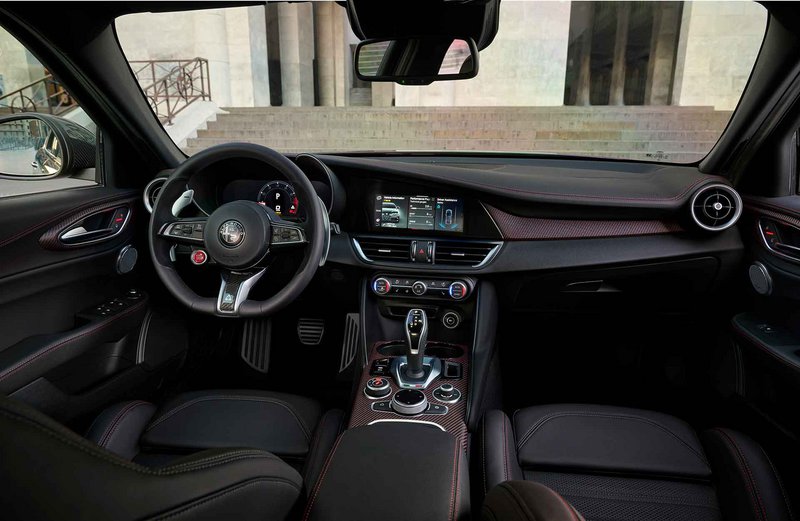 Ο σπορ χαρακτήρας ενισχύεται από το μειωμένο βάρος, με τη χρήση ελαφρών υλικών όπως αλουμίνιο για τον κινητήρα και ανθρακόνημα για τον κεντρικό άξονα μετάδοσης, το καπό, το σπόιλερ και τα μαρσπιέ. Στην Giulia η αεροδυναμική απόδοση ενισχύεται από τον ενεργό μπροστινό διαχωριστή από ανθρακονήματα, που ελέγχει τη ροή του αέρα κάτω από το πάτωμα για να αυξήσει την ευστάθεια και την απόδοση. Επιπλέον, ο κορυφαίος ήχος εξασφαλίζεται από το σύστημα εξάτμισης Akrapovic.