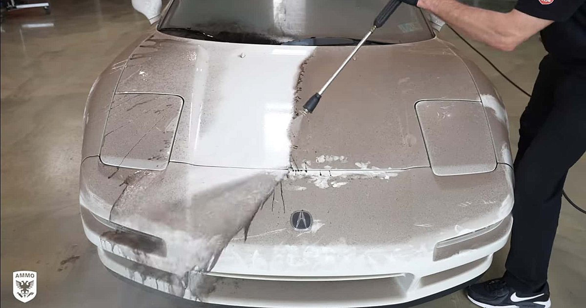 Ο Kosilla ξεκίνησε με ένα απλό πλύσιμο, ώστε να διαλυθεί η βρωμιά κι η μούχλα που είχε πιάσει το αμάξωμα, όμως αυτό δεν είναι αρκετό για το NSX να επανέλθει στην πρότερη κατάστασή του. Ένα πέρασμα με την μπάρα πηλού έφερε στην επιφάνεια ακόμη περισσότερη βρωμιά που είχε εγκατασταθεί πάνω στο εμβληματικό κεντρομήχανο σπορ μοντέλο.