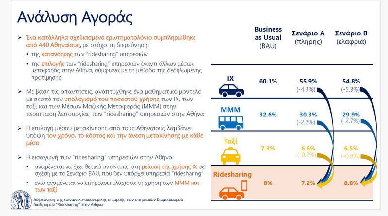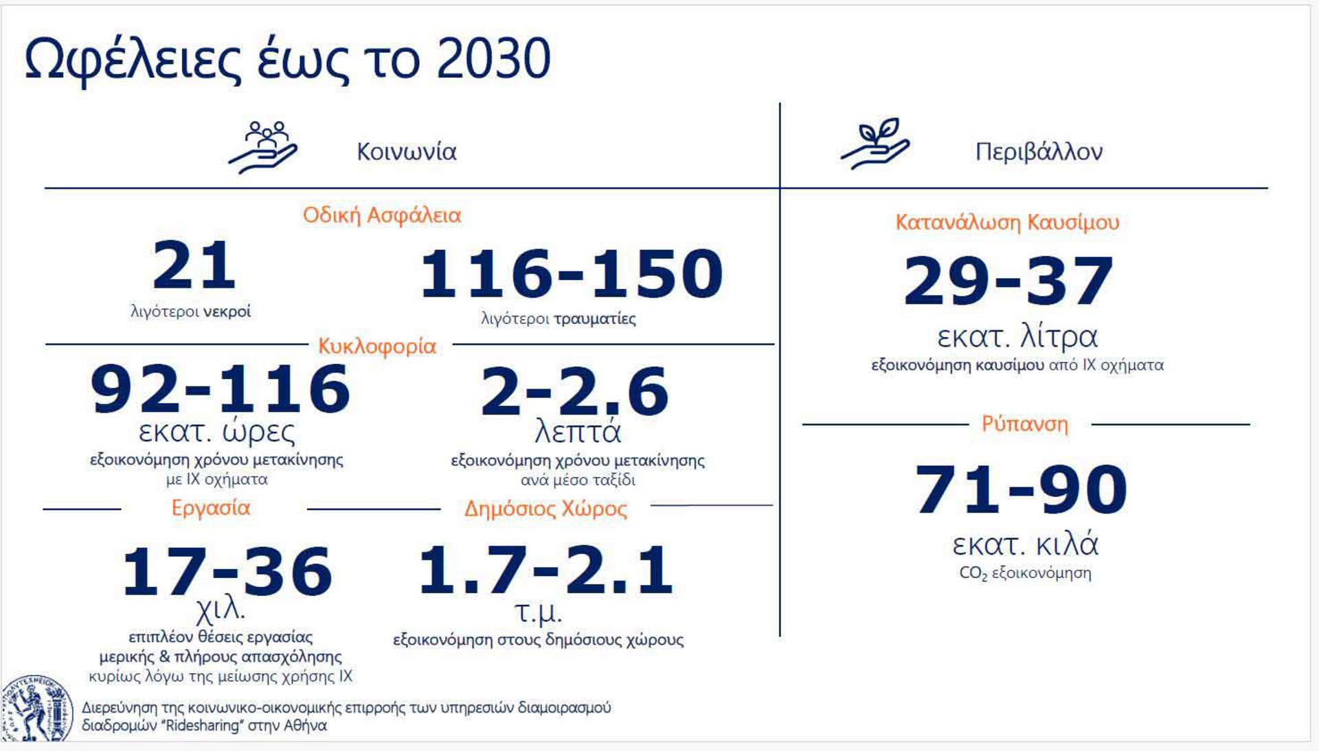 Η υιοθέτηση υπηρεσιών διαμοιρασμού διαδρομών «ridesharing» στην Αθήνα, έως το 2030, εκτιμάται ότι θα προσελκύσει μετακινούμενους κυρίως από ΙΧ, μειώνοντας τη χρήση αυτοκινήτων, θα δημιουργήσει επιπλέον θέσεις εργασίας οδηγών και θα μειώσει το χρόνο μετακινήσεων.