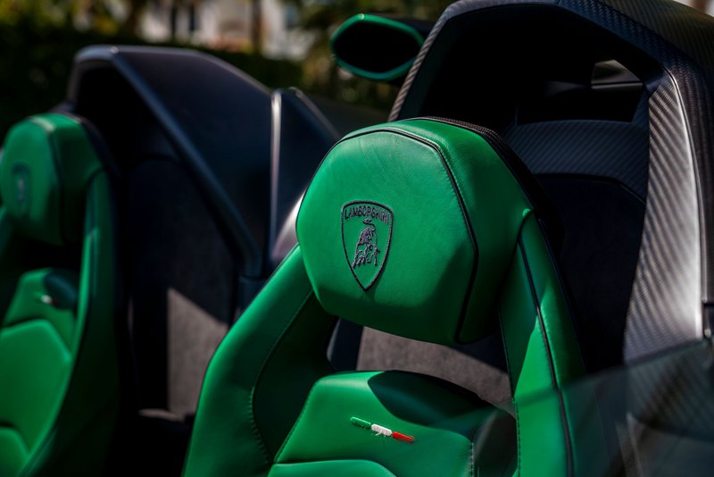Παρά την ακραία του εμφάνιση, που το κάνει να μοιάζει με αγωνιστικό, το μοντέλο της Lamborghini είναι απολύτως νόμιμο για τον δρόμο. Το συγκεκριμένο παράδειγμα έχει ματ μαύρο αμάξωμα με πράσινες (Verde) λεπτομέρειες. Τον ίδιο χρωματικό συνδυασμό βρίσκει κανείς και στο εσωτερικό, με τα καθίσματα, το τιμόνι, το ταμπλό και την κεντρική κονσόλα να έχουν επενδυθεί με δέρμα σε πράσινο χρώμα.