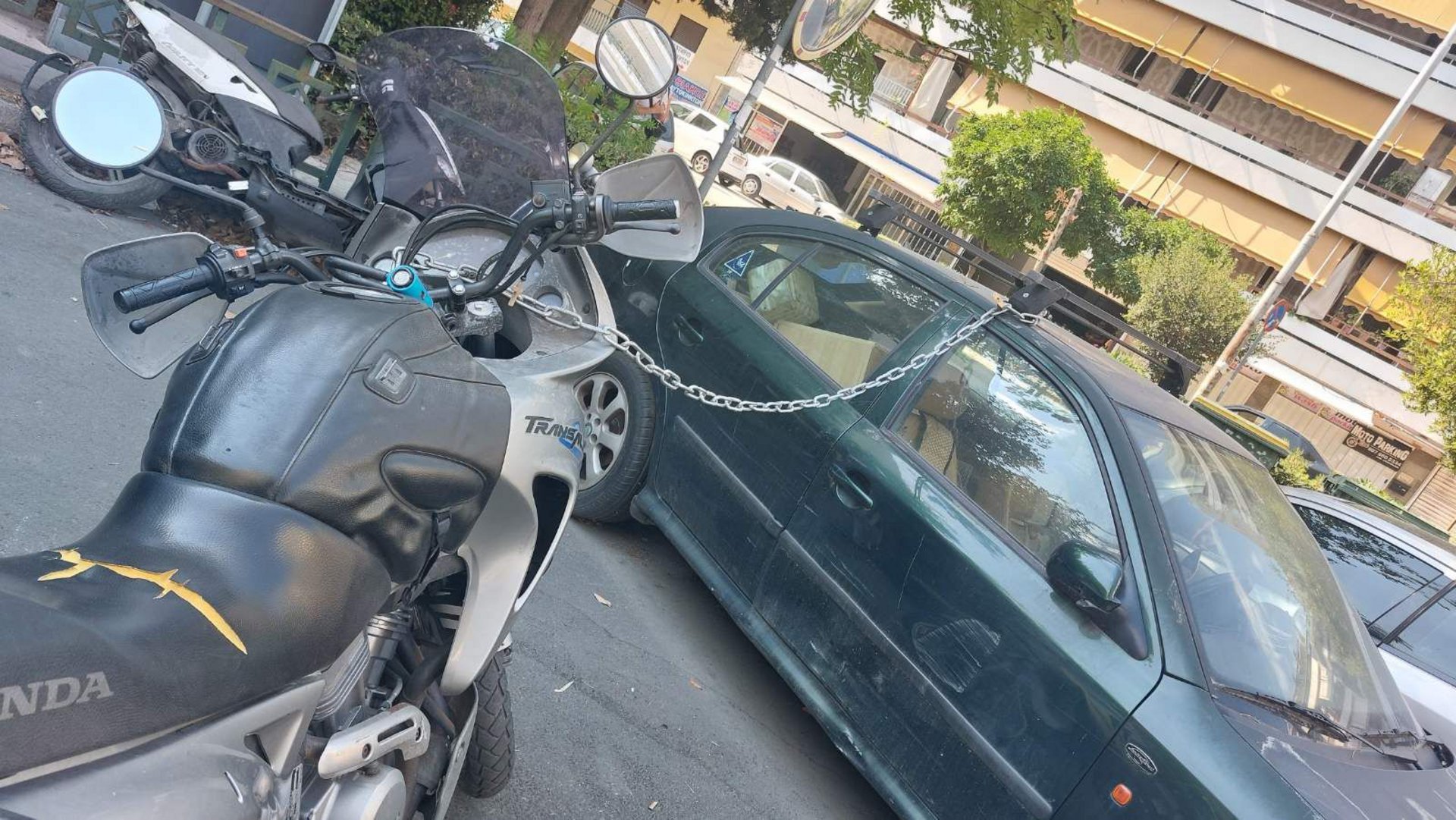 Όπως μπορείτε να δείτε και στη σχετική φωτογραφία ο κάτοχος της μοτοσυκλέτας αποφάσισε να την κλειδώσει με αλυσίδα πάνω στις μπάρες οροφής ενός αυτοκινήτου που ήταν σταθμευμένο δίπλα.